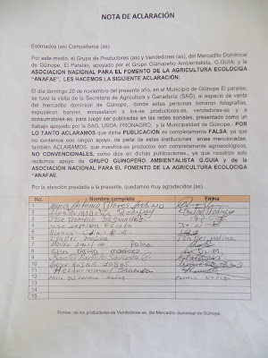 Amigas y amigos aprovechamos el espacio para hacer pública la siguiente nota de aclaración enviada a nuestras oficinas por parte de productoras y productores ecológicos del mercado local en Güinope. Quienes nos comparten el abuso del que fueron objeto por parte de empleados de gobierno de la SAG y PRONAGRO apoyados por USDA. Dichas publicaciones pueden revisarlas también en la página de Facebook de la SAG.